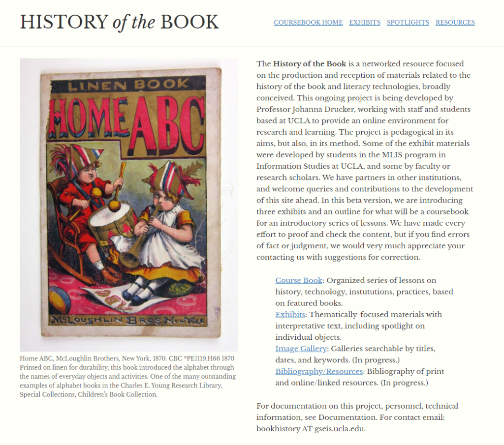 A resource for book history and literary technologies that includes exhibits, course materials, and a bibliography. Exhibits include medieval manuscripts, an exhibit on medieval scribes and their tools, and Renaissance toxicology manuscripts.