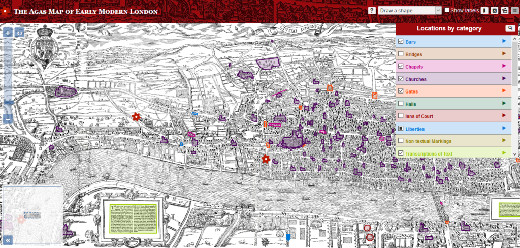 The Map of Early Modern London includes four interoperable projects: a digital edition of the 1561 Agas woodcut map of London; an Encyclopedia and Descriptive Gazetteer of London people, places, topics, and terms; a Library of marked-up texts rich in London toponyms; and a versioned edition of John Stow’s Survey of London.
