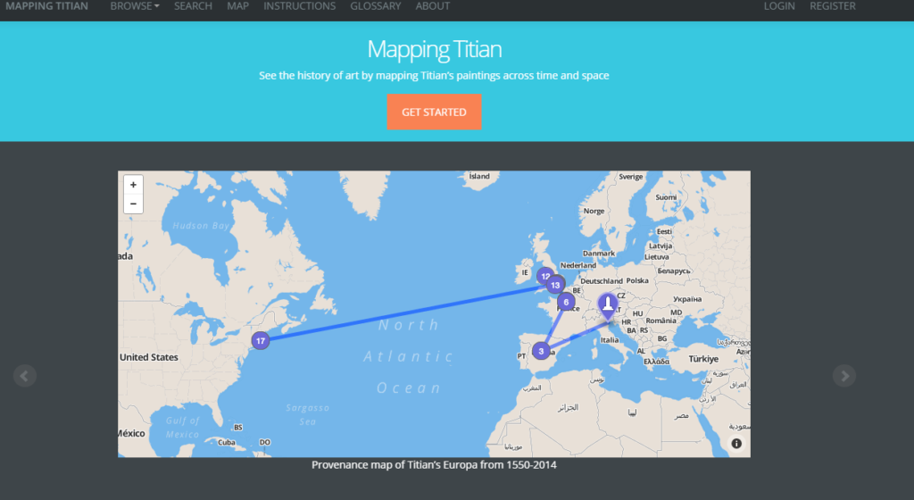 Mapping Titian allows users to visualize one of the most fundamental concerns of the discipline of Art History: the interrelationship between an artwork and its changing historical context. Focusing on the paintings executed by the Venetian Renaissance artist, Titian (ca. 1488-1576), this site offers a searchable provenance index of his attributed pictures and allows users to create customizable collections of paintings and customizable maps that show the movement of the pictures over time and space with the application of various filters.