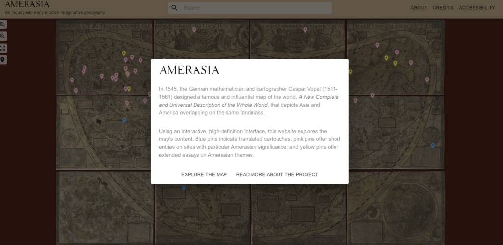 In 1545, the German mathematician and cartographer Caspar Vopel (1511-1561) designed a famous and influential map of the world, A New Complete and Universal Description of the Whole World, that depicts Asia and America overlapping on the same landmass. Using an interactive, high-definition interface, Amerasia explores the map’s content. Blue pins indicate translated cartouches, pink pins offer short entries on sites with particular Amerasian significance, and yellow pins offer extended essays on Amerasian themes.