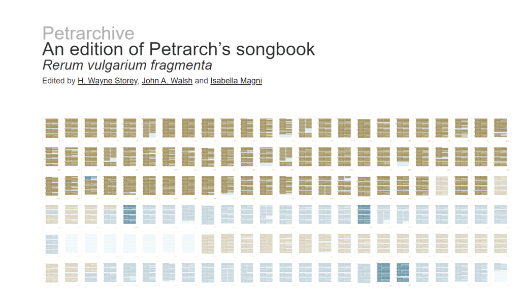 The Petrarchive (ed. Storey, Walsh and Magni) is an open access rich-text digital edition of Petrarch’s songbook Rerum vulgarium fragmenta (Rvf). The website does not reproduce in OCR other editions but proposes a new digital way of visualizing, studying and teaching Petrarch’s work by offering different levels of visualization of the texts (facsimile high-quality images of all the chartae of the partial holograph Vaticano Latino 3195, its complete diplomatic transcriptions and edited forms, a prototype for a new eleven-section commentary including a new English translation), as well as multiple indices and tools to access the diverse strata of the work’s composition.