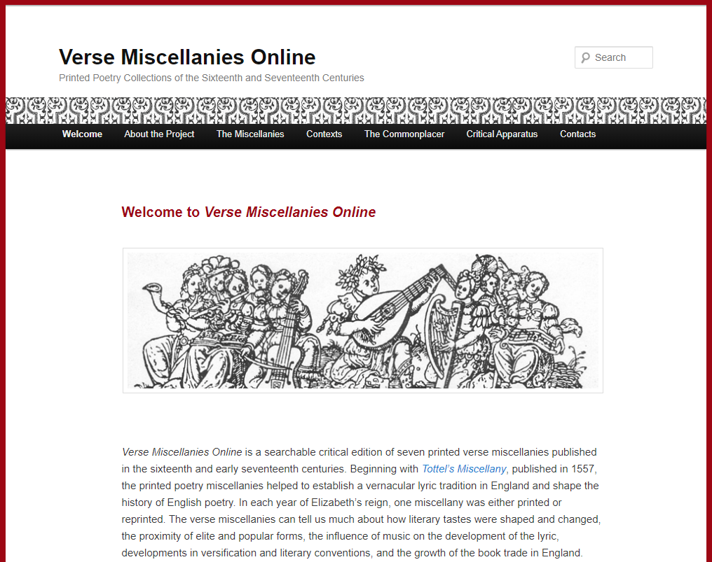 Verse Miscellanies Online is a searchable critical edition of seven printed verse miscellanies published in the sixteenth and early seventeenth centuries.